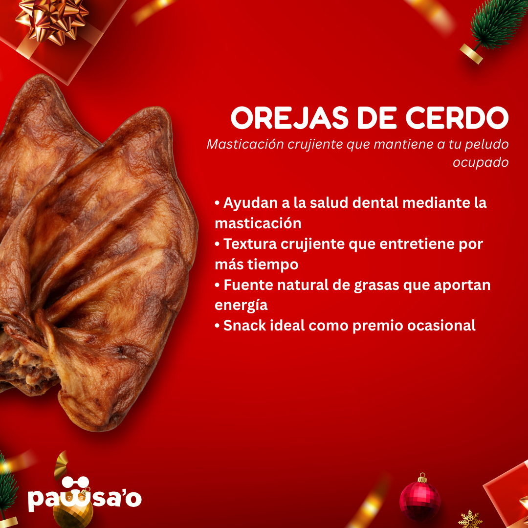 2 orejas de cerdo — masticables crujientes que ayudan a mantener a tu peludo ocupado y estimulado.